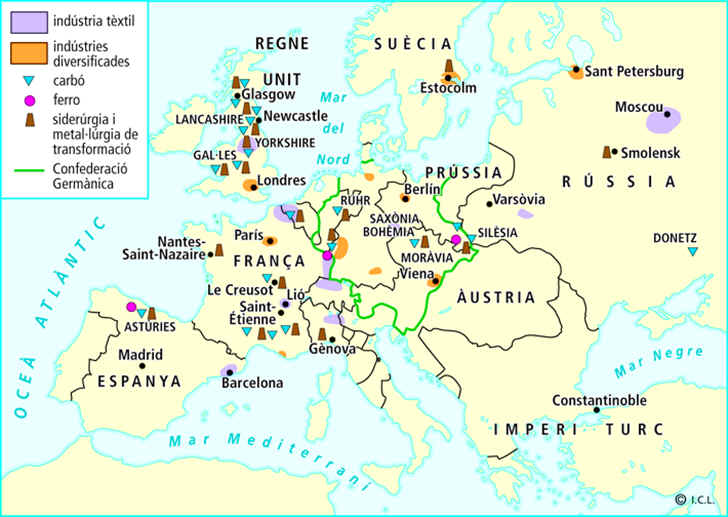 – Al sud d’Europa van coexistir regions industrialitzades i zones essencialment rurals. L’Europa oriental es va mantenir al marge del procés d’industrialització fins al segle XX.