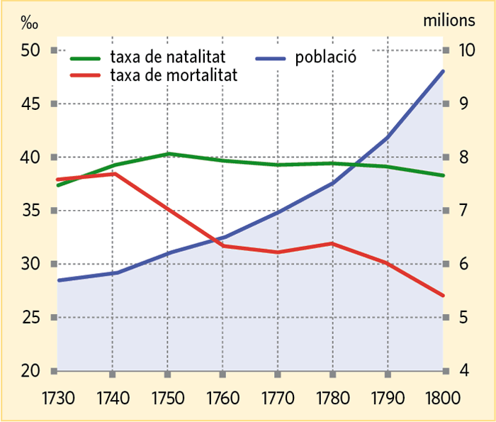 • Les causes d’aquest canvi demogràfic van ser l’augment de la producció d’aliments i el progrés de la higiene i la medicina, que van significar una disminució de la mortalitat i un lleuger increment de la natalitat.