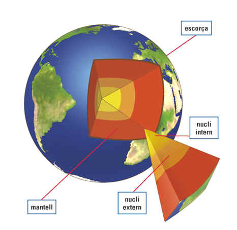 – Nucli. Capa més interna de la Terra dividida, al seu torn, en dues capes: nucli intern i nucli extern. Representa un 15% del volum total del planeta.