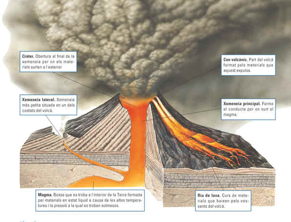 • Un volcà és una esquerda de l’escorça terrestre per la qual el magma ascendeix i surt a l’exterior en forma d’erupció volcànica. Durant les erupcions volcàniques s’expulsen gasos, cendres, pedres i lava incandescent. Aquests materials, en contacte amb l’aire, es refreden, s’acumulen i formen cons volcànics. Els cons volcànics poden convertir-se en muntanyes, o illes si l’erupció és marina.