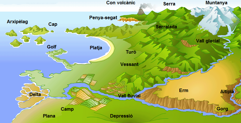 • La superfície terrestre no és llisa ni uniforme, sinó que presenta diverses formes de relleu: muntanyes, planes, altiplans, valls, depressions…