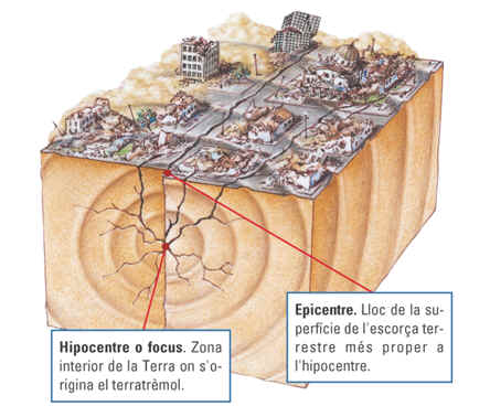 • Un terratrèmol és la conseqüència del moviment de plaques a l’interior de la Terra que es propaga des del focus o hipocentre en totes direccions per mitjà d’ones sísmiques. L’epicentre és el punt de la superfície terrestre on es manifesta més el terratrèmol.