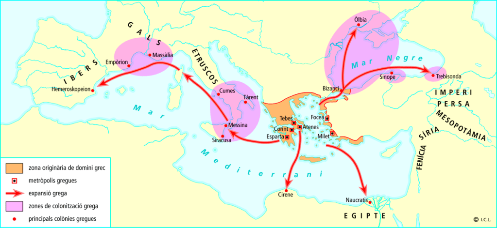 • Entre els segles VIII i VI a.C., nombrosos habitants de les ciutats de Grècia van emigrar a diversos llocs de les costes mediterrànies i del mar Negre.