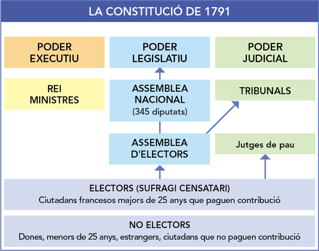 – El 1791 es va promulgar una Constitució, que va exemplificar els ideals del liberalisme polític: separació de poders, sobirania nacional, igualtat legal dels ciutadans; encara que reservava al rei el dret de veto i es va establir el sufragi indirecte i censatari.