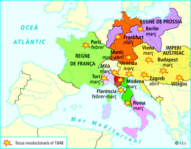 • Les revolucions de 1848 van comportar el triomf dels ideals democràtics i el reconeixement de drets dels treballadors. A Hongria, Bohèmia, el Nord d’Itàlia i la Confederació Germànica van tenir, a més, un caràcter nacionalista contra els imperis.