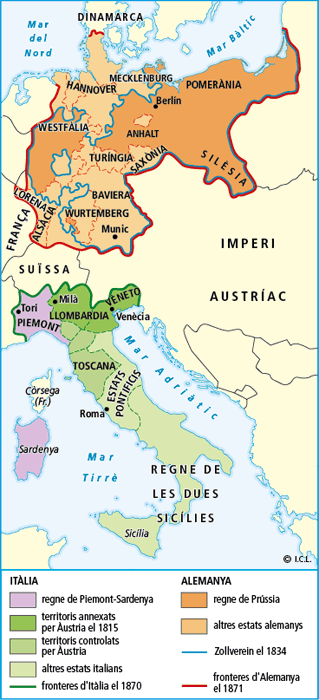 • En la unificació d’Alemanya, dividida en 36 Estats, van rivalitzar Àustria i Prússia. Entre 1861 i 1874, Prússia, amb Otto von Bismarck com a canceller, va resoldre el problema amb guerres contra Dinamarca, Àustria i França.