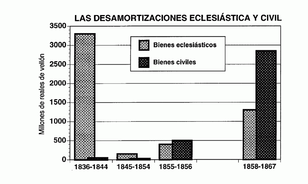 • La reforma agrària liberal espanyola, duta a terme pels progressistes a partir de 1837, va abolir el règim senyorial, es va desvincular la propietat i va desamortitzar bona part de les propietats de l’Església (1836) i dels ajuntaments (1855).