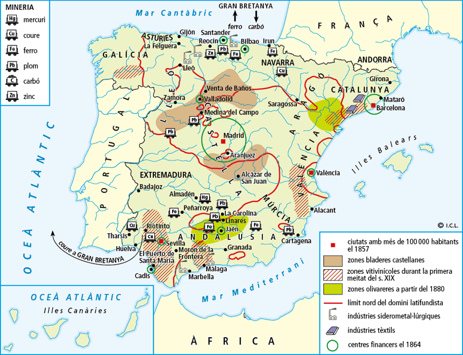 • El subsòl espanyol és ric en jaciments miners i la seva explotació massiva va començar a partir de la legislació de mines de 1868.