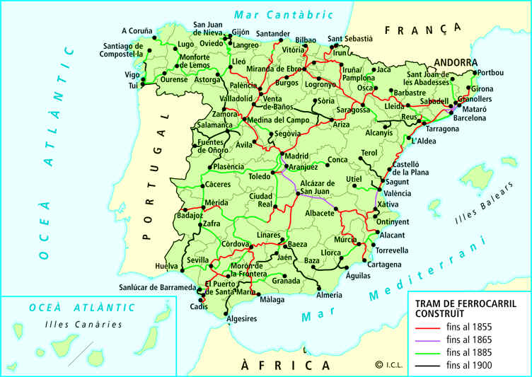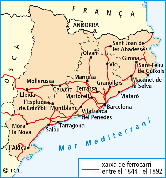 • La xarxa ferroviària es va iniciar a mitjan segle XIX, amb materials importats i seguint una estructura radial que dificultava els intercanvis amb la resta d’Europa. Però, malgrat aquestes limitacions, el ferrocarril va tenir efectes positius per a l’economia espanyola, ja que va afavorir el trasllat de persones i mercaderies.