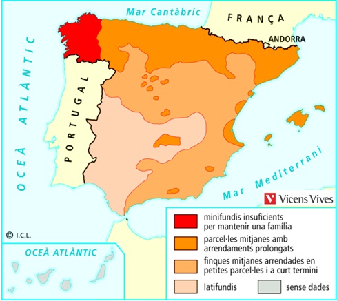 • En el conjunt d’Espanya, l’estructura de la propietat, repartida excessivament en latifundis i minifundis, no va ajudar a millorar el nivell de vida dels pagesos.