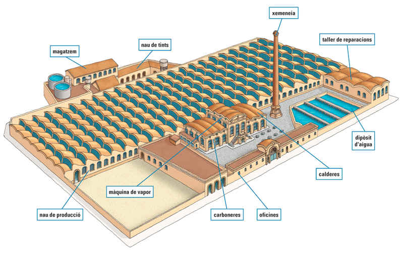• La indústria tèxtil catalana va ser el primer sector a mecanitzar-se i, entre 1830 i 1860, es van generalitzar els vapors. A partir de 1860, amb el fi d’aprofitar la força hidràulica dels rius, van sorgir les colònies industrials.