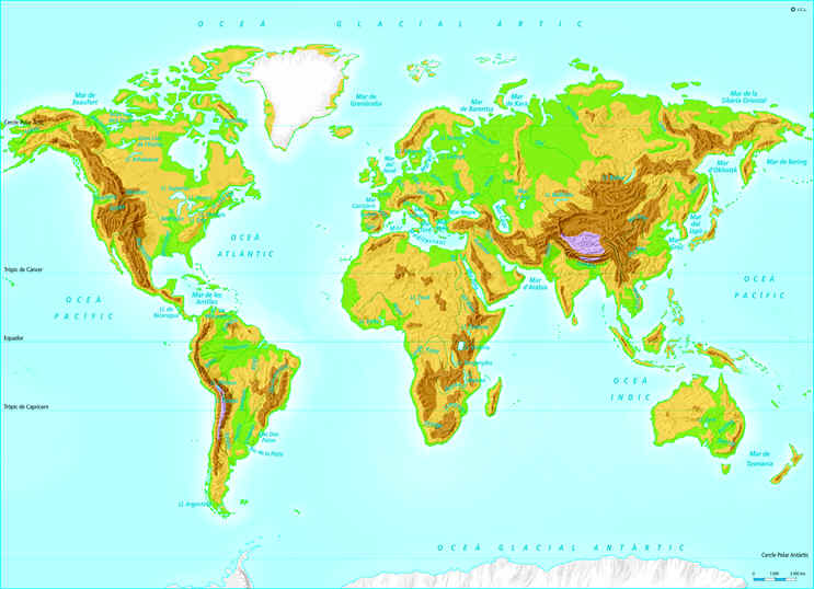 – Àsia: és el continent més gran de la Terra; es divideix en quatre zones: planes al nord, grans serralades i altiplans al sud d’Àsia central, penínsules al sud i arxipèlags a l’est.
