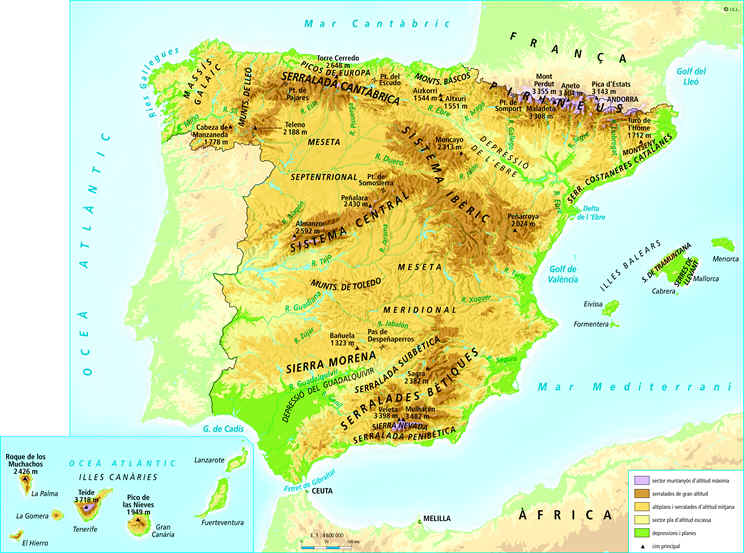 • La Península té una altitud mitjana elevada a causa de la presència de nombroses serralades i de la Meseta.