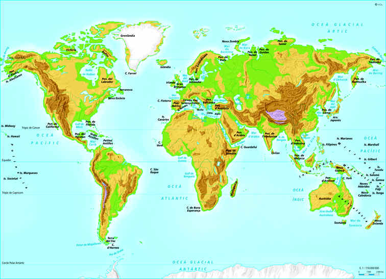 – Amèrica: ocupa part dels dos hemisferis i es divideix en Amèrica del Nord, Amèrica del Sud i Amèrica Central. Per l’oest s’estén un eix de muntanyes joves.