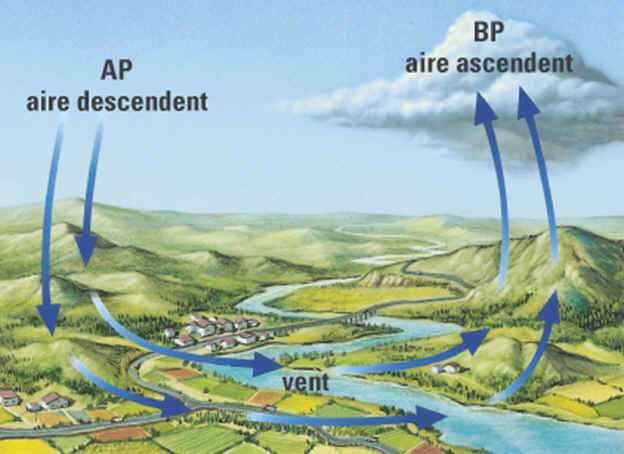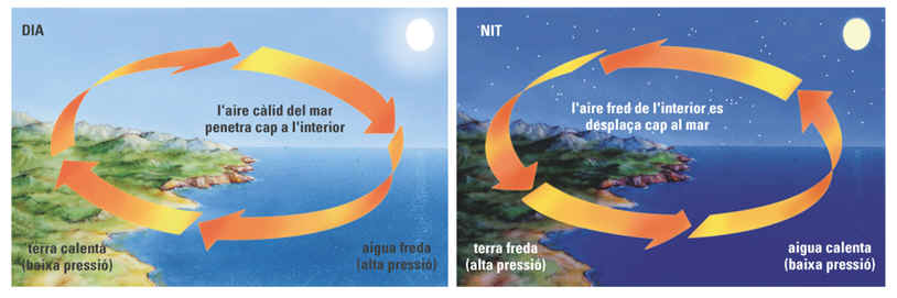 – La temperatura de l’aire: si l’aire és càlid, significa que l’aire pesa poc i puja, i dóna lloc a a baixes pressions (depressions o borrasques) Si l’aire és fred és més pesant i baixa, i dóna lloc a altes pressions o anticiclons.