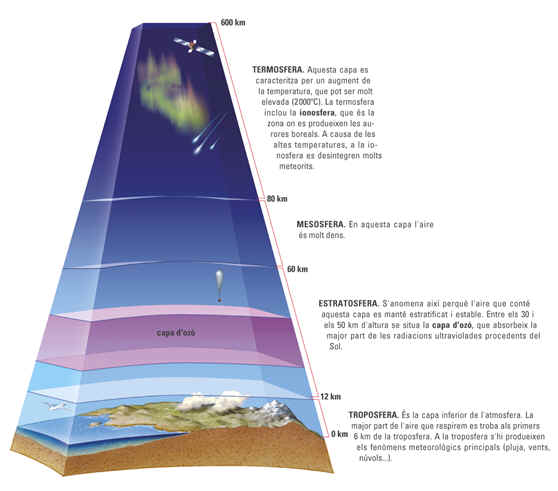 – Troposfera: és la més propera a la Terra i s’hi donen els fenòmens meteorològics.