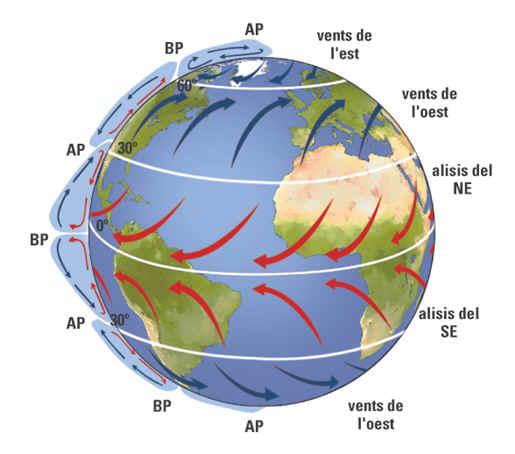 • Hi ha diferents tipus de vents: els constants (com els alisis a l’equador) que sempre bufen en la mateixa direcció, els estacionals (monsons) que canvien de direcció segons les estacions, i els locals (cerç, llevant, tramuntana…).