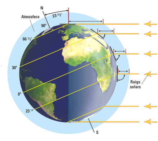 – El factor que influeix més en la temperatura és la insolació i la insolació depèn en gran mesura de la latitud o distància a l’equador: com que els raigs del Sol cauen perpendicularment a l’equador, a mesura que ens n’allunyem, la temperatura baixa.