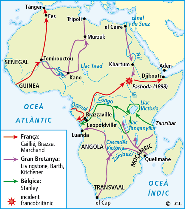 • Britànics i francesos van realitzar les primeres expedicions. Van recórrer i cartografiar l’Àfrica central.