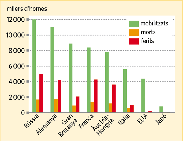 • Les conseqüències demogràfiques (al voltant de 10 milions de soldats morts) i les pèrdues materials (disminució de la riquesa nacional) van ser molt greus i van dificultar la recuperació dels països.