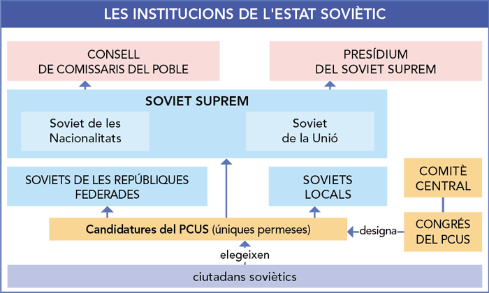 • El nou Estat, organitzat de forma federal i amb un parlament (Soviet Suprem), estava però sota el control absolut del PCUS, perquè la resta de partits polítics van ser prohibits. Es tractava, per tant, d’un sistema totalitari.