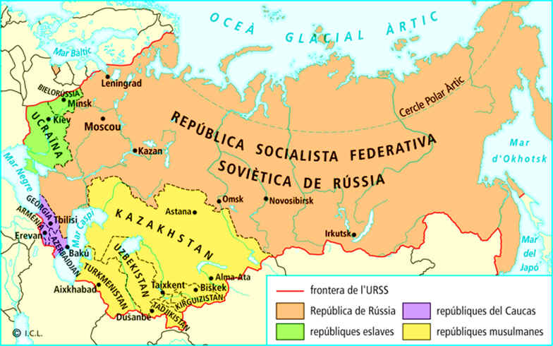 • El 1922 es va crear l’URSS (Unió de Repúbliques Socialistes Soviètiques), un Estat federal que reunia totes les nacionalitats del vell imperi dels tsars.
