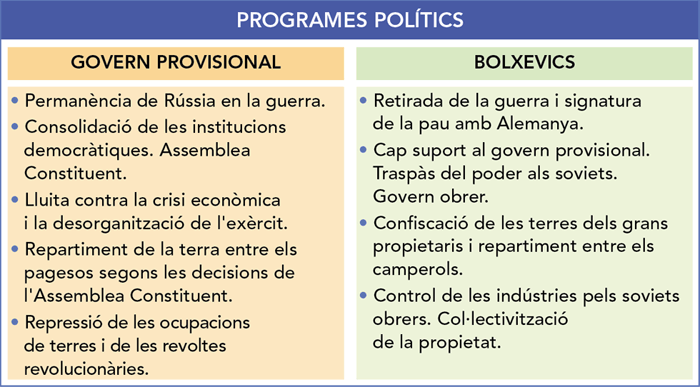 • Amb el suport del Congrés dels Soviets de Rússia, Lenin va formar un govern obrer i es van establir les primeres mesures revolucionàries. A més, Rússia va firmar la pau amb Alemanya a canvi de territoris.