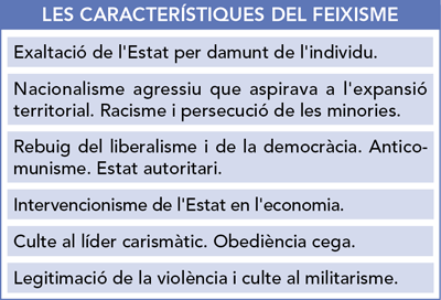 • Els feixismes seran règims totalitaris, que acabaran amb la seva derrota en la Segona Guerra Mundial, amb les excepcions d’Espanya, Portugal i Grècia (feixismes residuals).