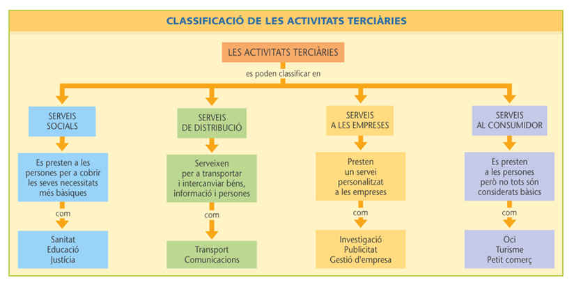 | SEGONS EL TIPUS DE NECESSITAT QUE COBREIXEN O A QUI VAN DESTINATS | • Serveis socials: cobreixen necessitats bàsiques de la població (administració, sanitat, educació, justícia…) • Serveis de distribució: faciliten l’intercanvi de béns, serveis o informació (comerç, transport, comunicacions…) • Serveis a empreses: serveis especialitzats per fer funcionar les empreses (serveis diversos de caràcter informàtic, jurídic, fiscal, publicitari, recursos humans, comptable…) (investigació, publicitat, gestió d’empresa…) • Serveis al consumidor: serveis no imprescindibles (petit comerç, hostaleria, oci, turisme… |