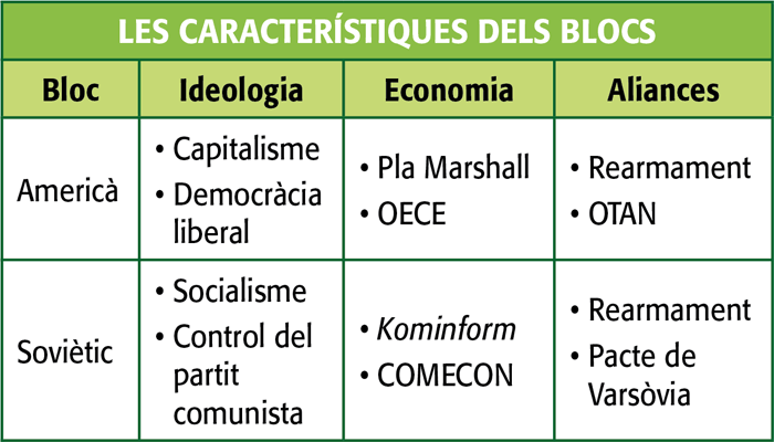 • Des del 1945 fins al 1990, el món va estar dividit en dos blocs antagònics: el socialista, dirigit per l’URSS, i el capitalista, liderat pels EUA.