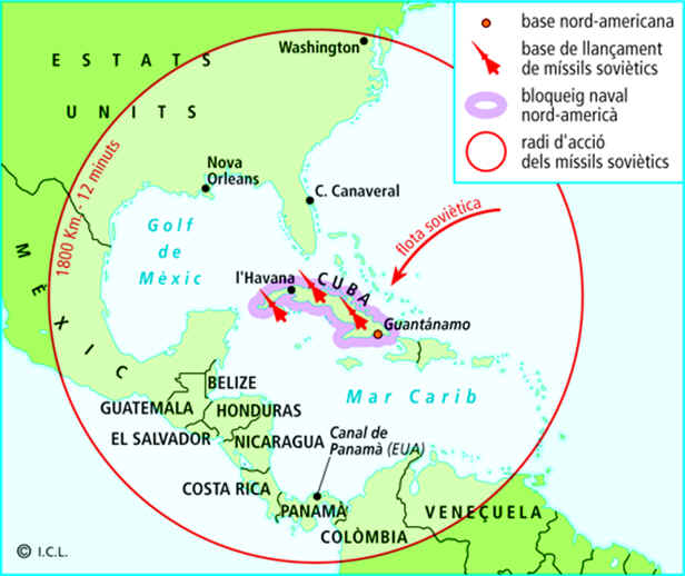 – La crisi dels míssils de Cuba (1962). Després d’instal·lar-se a Cuba el règim de Fidel Castro, el govern nord-americà va boicotejar econòmicament Cuba, que aviat va rebre ajuda de l’URSS.
