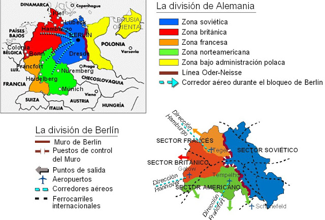 • Al final de la guerra, aquest país havia quedat dividit en quatre zones ocupades per britànics, francesos, nord-americans i soviètics. La mateixa divisió es va fer a la capital Berlín.