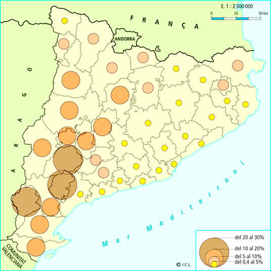 • A Catalunya la població que treballa al sector primari és un 2,5%. Les terres d’ús agrícola es localitzen sobretot a la Depressió Central, al delta de l’Ebre i a les planes del litoral.