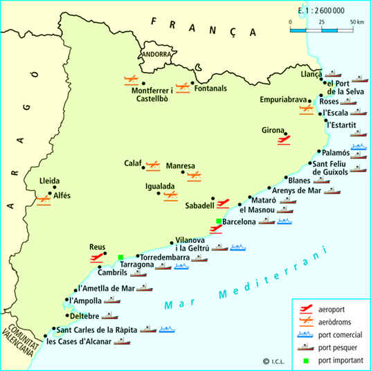 • Ports i aeroports. Barcelona i Tarragona són els ports amb més activitat comercial. Catalunya compta amb quatre aeroports: Barcelona (el més important), Girona, Reus i Sabadell.