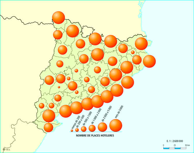 • Oferta d’allotjament turístic. A causa de la seva llarga tradició com a centre turístic, Catalunya té una gran capacitat d’allotjament, una de les més importants de l’Estat espanyol. Avui es disposa de més de 500000 places turístiques.