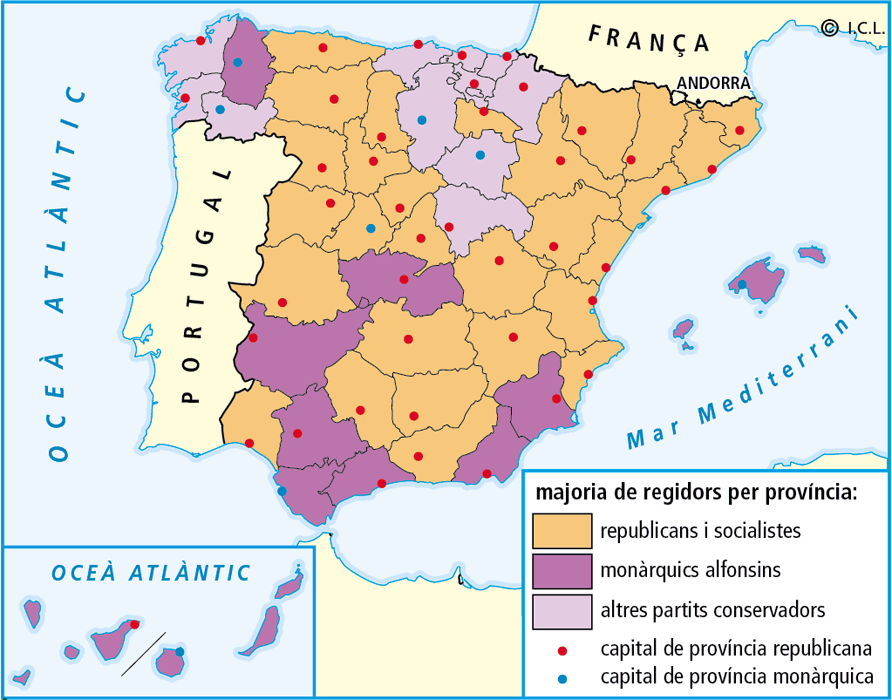 • Davant de la nova situació, el rei Alfons XIII va suspendre la potestat reial i va abandonar el país cap a l’exili. El 14 d’abril de 1931 es va proclamar la República.