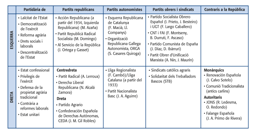 – L’hegemonia estava en mans d’Esquerra Republicana de Catalunya (ERC), liderada per Macià i Companys. A la dreta hi havia la Lliga Regionalista, que va passà a denominar-se Lliga Catalana.