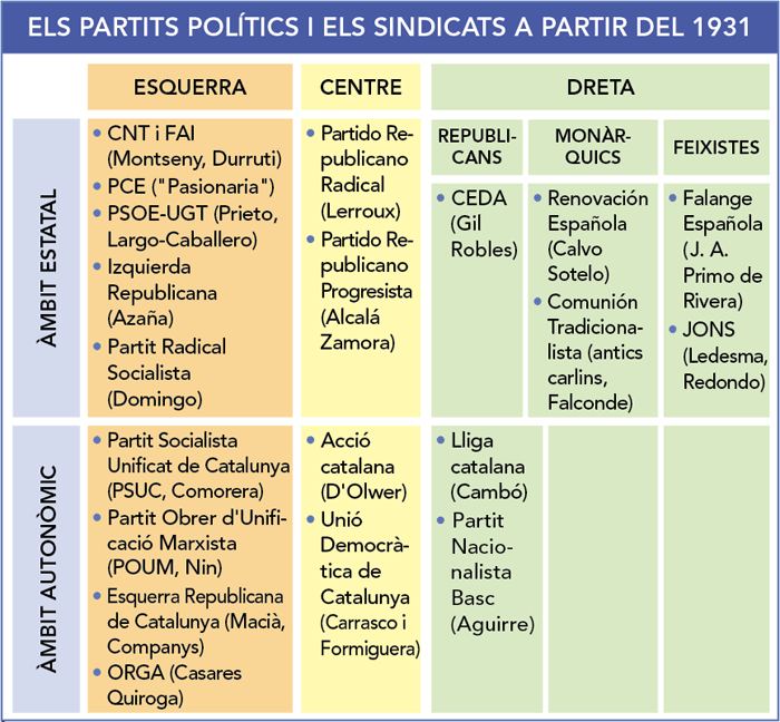 – També hi havia partits de caire marxista, com el Partit Obrer d’Unificació Marxista (POUM) i el Partit Socialista Unificat de Catalunya (PSUC).