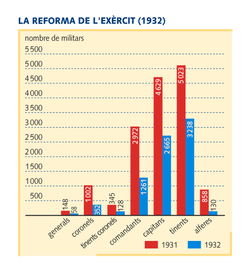 – Reforma militar: Azaña va iniciar la reforma de l’exèrcit, elaborant una llei de retirs que va possibilitar la jubilació de la meitat dels oficials; es va sotmetre l’exèrcit al poder civil; i es van substituir els comandaments considerats contraris a la República.