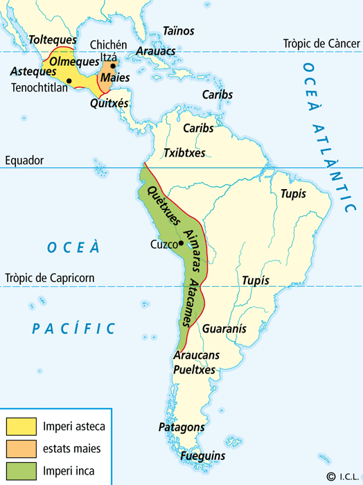 • Quan van arribar els europeus al continent americà, els pobles que l’habitaven havien desenvolupat civilitzacions pròsperes i alguns havien creat grans imperis: asteca, maia i inca.