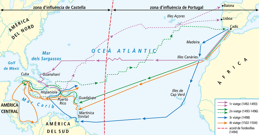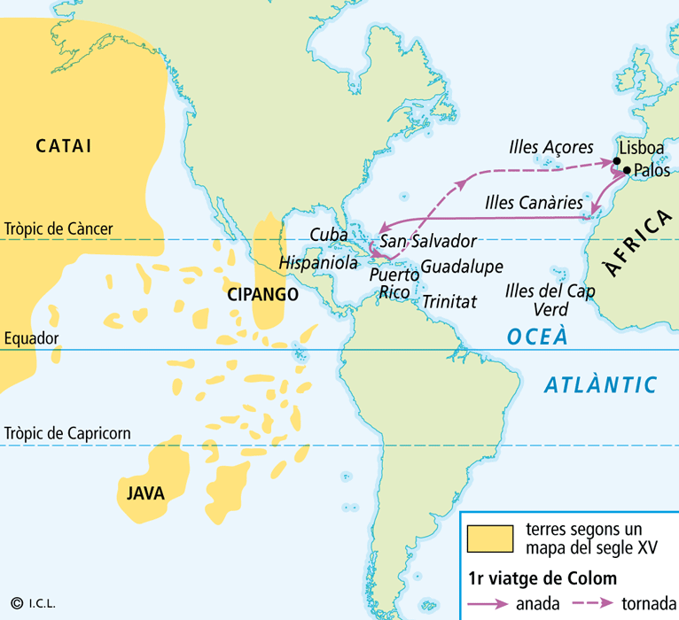 • El primer viatge. La primera expedició de Colom va sortir del port de Palos l’agost de 1492. Les embarcacions van iniciar la travessia de l’Atlàntic, i el 12 d’octubre de 1492 van veure terra.