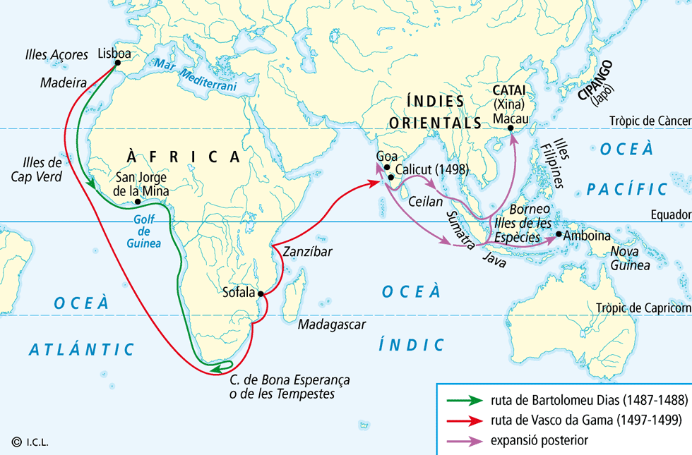 – La ruta de l’Índia. L’expedició dirigida per Vasco da Gama, va arribar fins a la costa de l’Índia (1498), obrint el camí posterior cap a les illes de les Espècies.