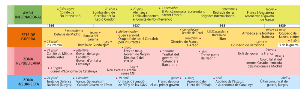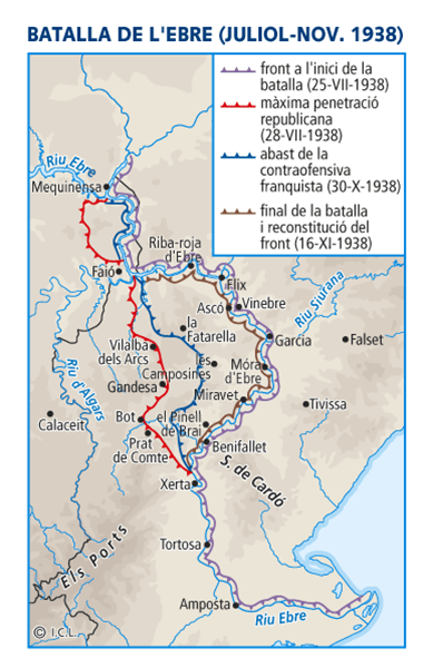 – La Batalla de l’Ebre (juliol-novembre de 1938). El 1938, les tropes sublevades van avançar sobre Aragó i van arribar al Mediterrani per la zona de Castelló, deixant Catalunya aïllada. Per impedir el progrés dels sublevats, el govern de la República va concentrar les seves forces a la Batalla de l’Ebre, però, després de durs combats, els republicans es van haver de replegar.
