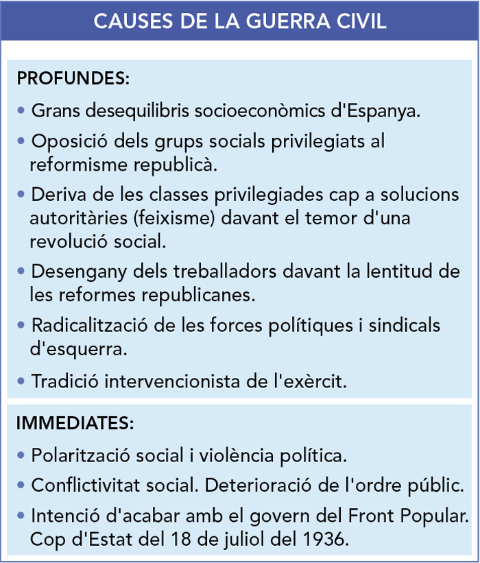 • Al juliol de 1936, un sector important de l’exèrcit va protagonitzar un cop d’Estat, al qual es van unir les organitzacions polítiques antirepublicanes (falangistes, tradicionalistes, monàrquics…)