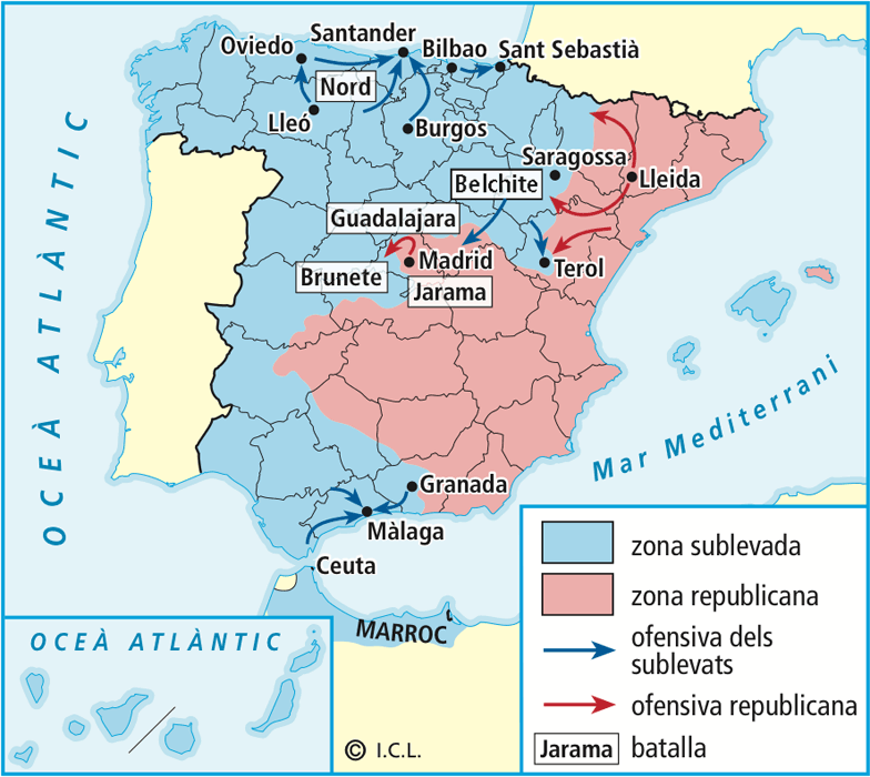• A finals de 1936 la República encara mantenia les ciutats industrials. La guerra va tenir diferents episodis: