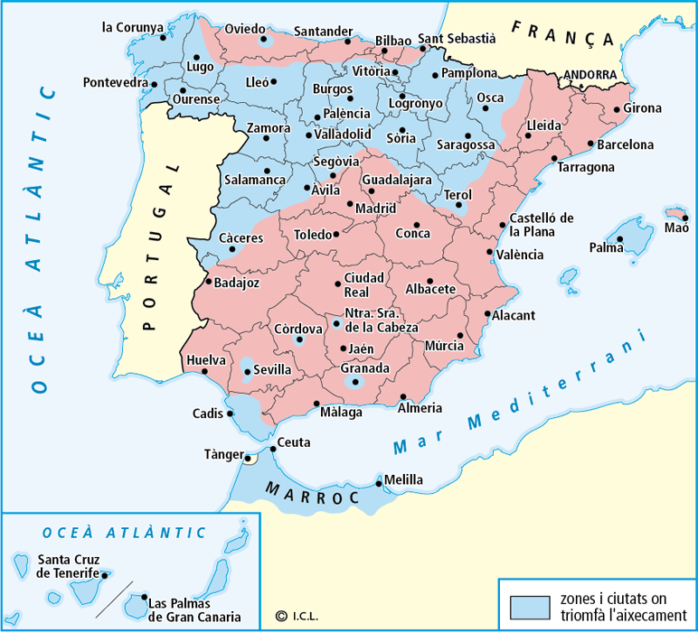 • Espanya va quedar dividida en dues zones, cosa que va desencadenar la Guerra Civil: l’alçament va triomfar a les regions agrícoles i d’orientació política conservadora, i va fracassar a les grans ciutats i les principals regions industrials i obreres.