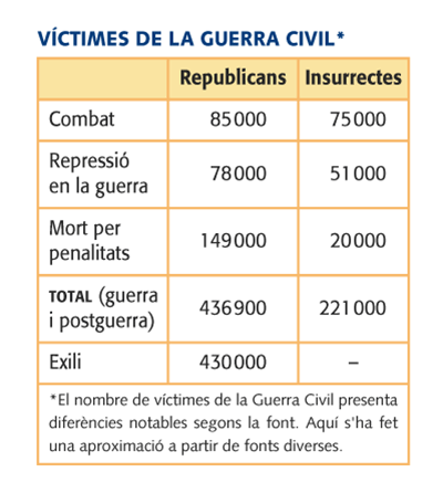 – Van morir més de mig milió d’espanyols. A aquesta xifra s’hi han d’afegir unes 470000 persones que es van exiliar a França, Amèrica Llatina i la URSS, davant de la repressió franquista.
