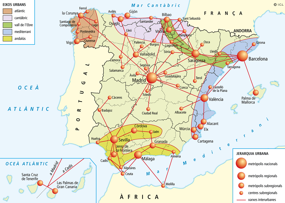 • Les ciutats espanyoles es classifiquen segons una jerarquia de ciutats, d’acord amb els seus habitants, les funcions que fan i l’extensió de la seva àrea d’influència: