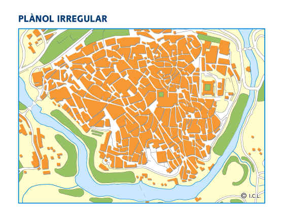 • El pla irregular és propi dels centres històrics i mostra una trama densa, intricada i irregular amb carrers estrets.