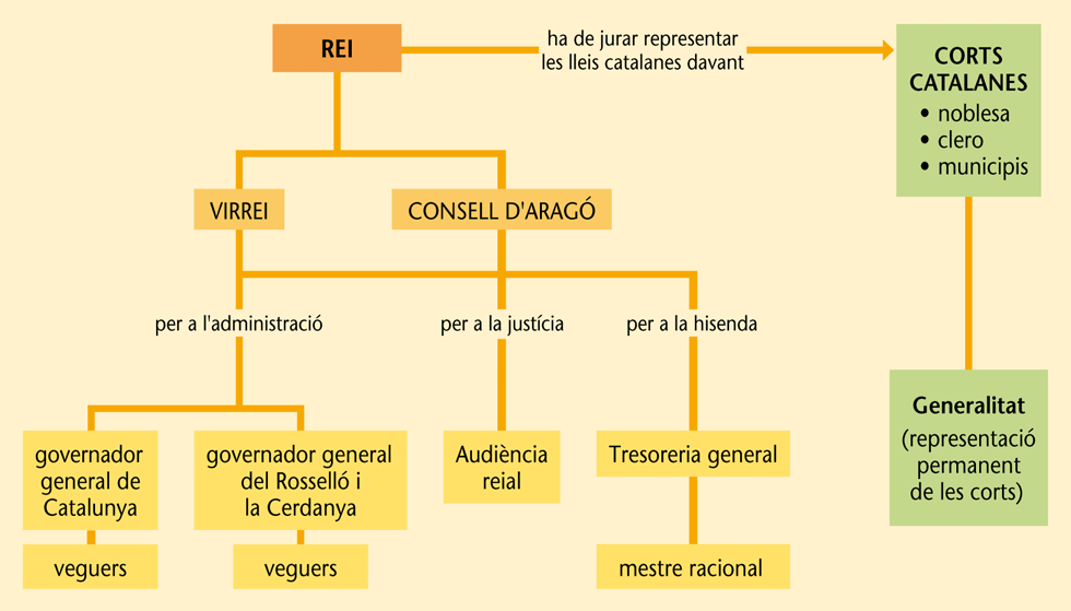 • El poder de la monarquia a Catalunya s’articulava per mitjà de dos organismes, que feien d’intermediaris entre el rei i l’antiga Corona d’Aragó: